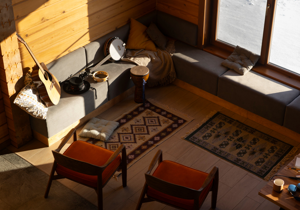 Un’attenzione particolare va riservata alle finiture, superfici opache, spazzolate o oliate mantengono un aspetto naturale e si adattano meglio alla vita quotidiana in montagna. Ci sono poi i tessili, lana, bouclé, lino spesso e cotone pesante sono ottimi per migliorare il comfort visivo e tattile. Tappeti strutturati, plaid e tende ben corpose rendono gli spazi più accoglienti e completano l’arredo in modo coerente.